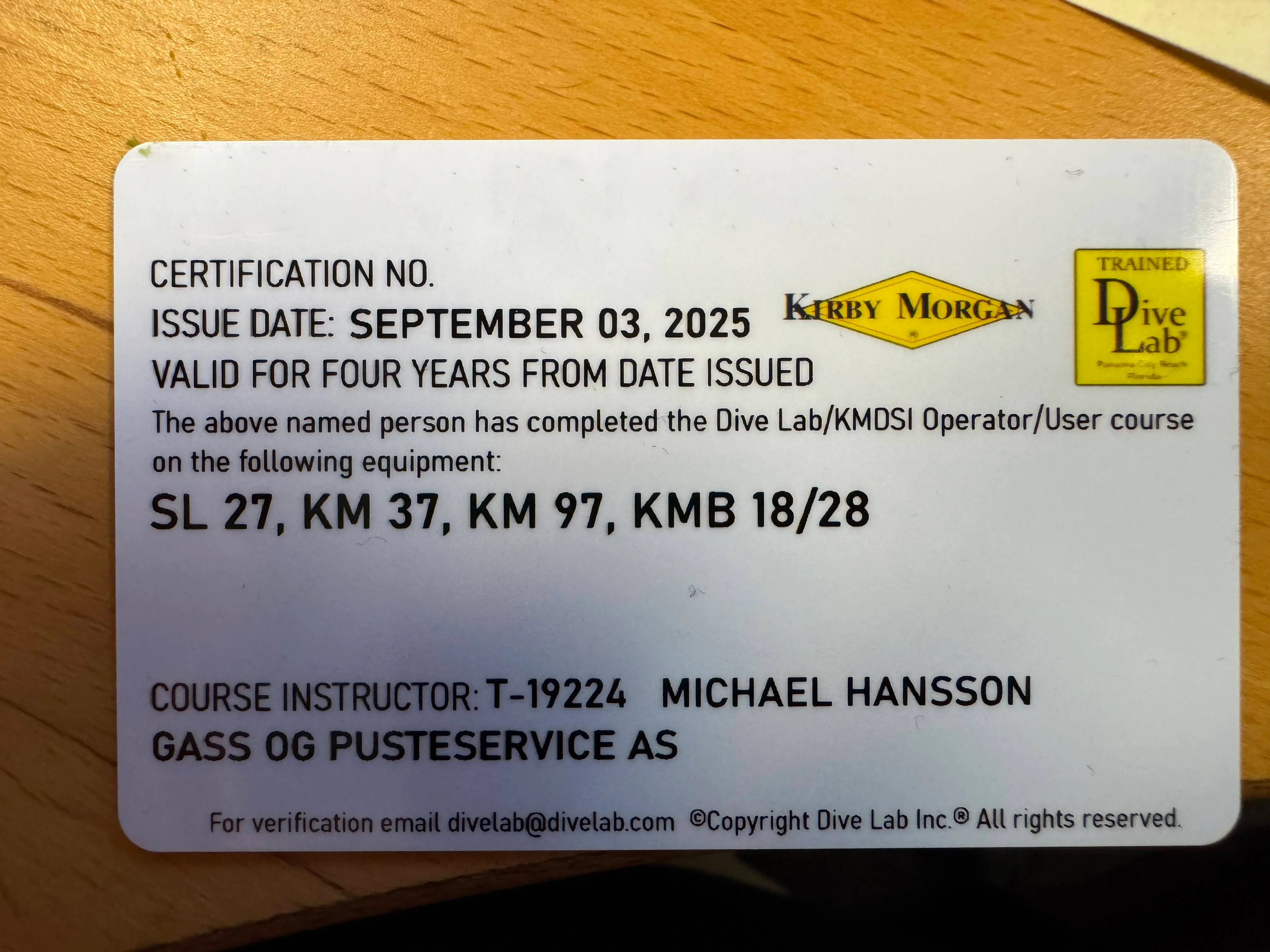 Offisielt sertifikat fra Kirby Morgan / DiveLab
